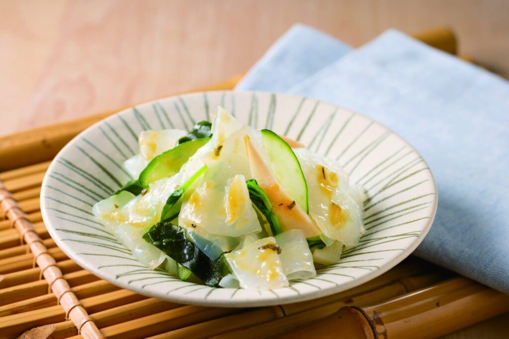 こんにゃくにお好みの海藻やお野菜と和えてすぐに出来上り。具材と良く絡むからし酢味噌付き。