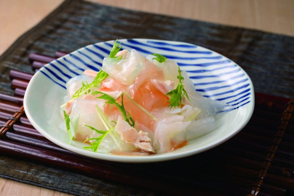 こんにゃくにお好みの海藻やお野菜と和えてすぐに出来上り。風味豊かな”梅だれ”付き。