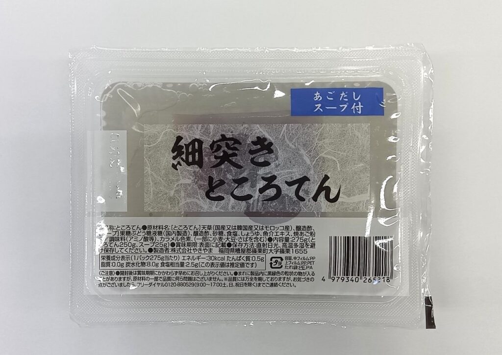 | 原材料 | [ところてん]天草(国産又は韓国産又はモロッコ産)、醸造酢、[スープ]果糖ぶどう糖液糖(国内製造)、醸造酢、砂糖、食塩、しょうゆ、魚介エキス、焼あご粉末/調味料(アミノ酸等)、カラメル色素、(一部に小麦・大豆・さばを含む) |